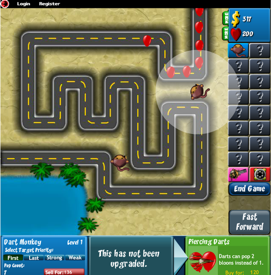 터렛을 적절히 설치하여 쳐들어오는 풍선들을 막으면 됩니다. 풍선이 맵 끝쪽으로 가게되면 체력이 까이고, 체력이 전부 깎이면 게임 오버!